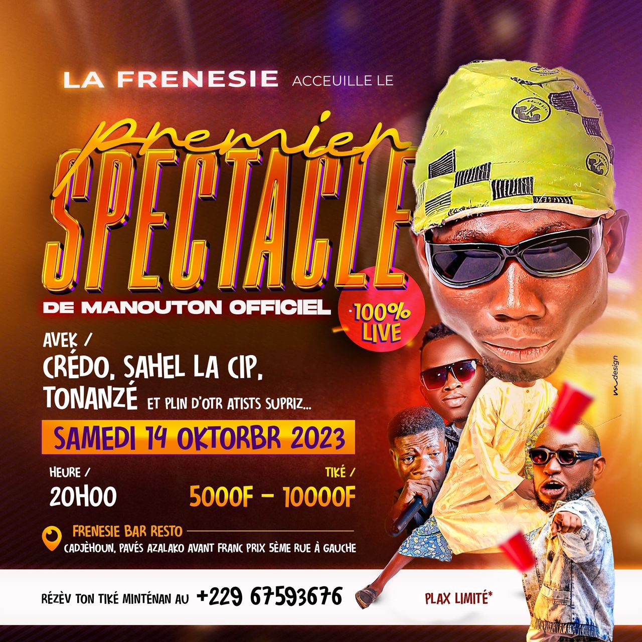 Manouton Officiel organise son premier spectacle 100% live le samedi 14 octobre 2023 à la Frénésie située à Cadjehoun. Sahel la CIP, Tonaze, Credo et d’autres artistes seront également en 100% live sur la plupart de leurs morceaux que vous aimez tant. Les tickets sont disponibles mais les places très limitées.